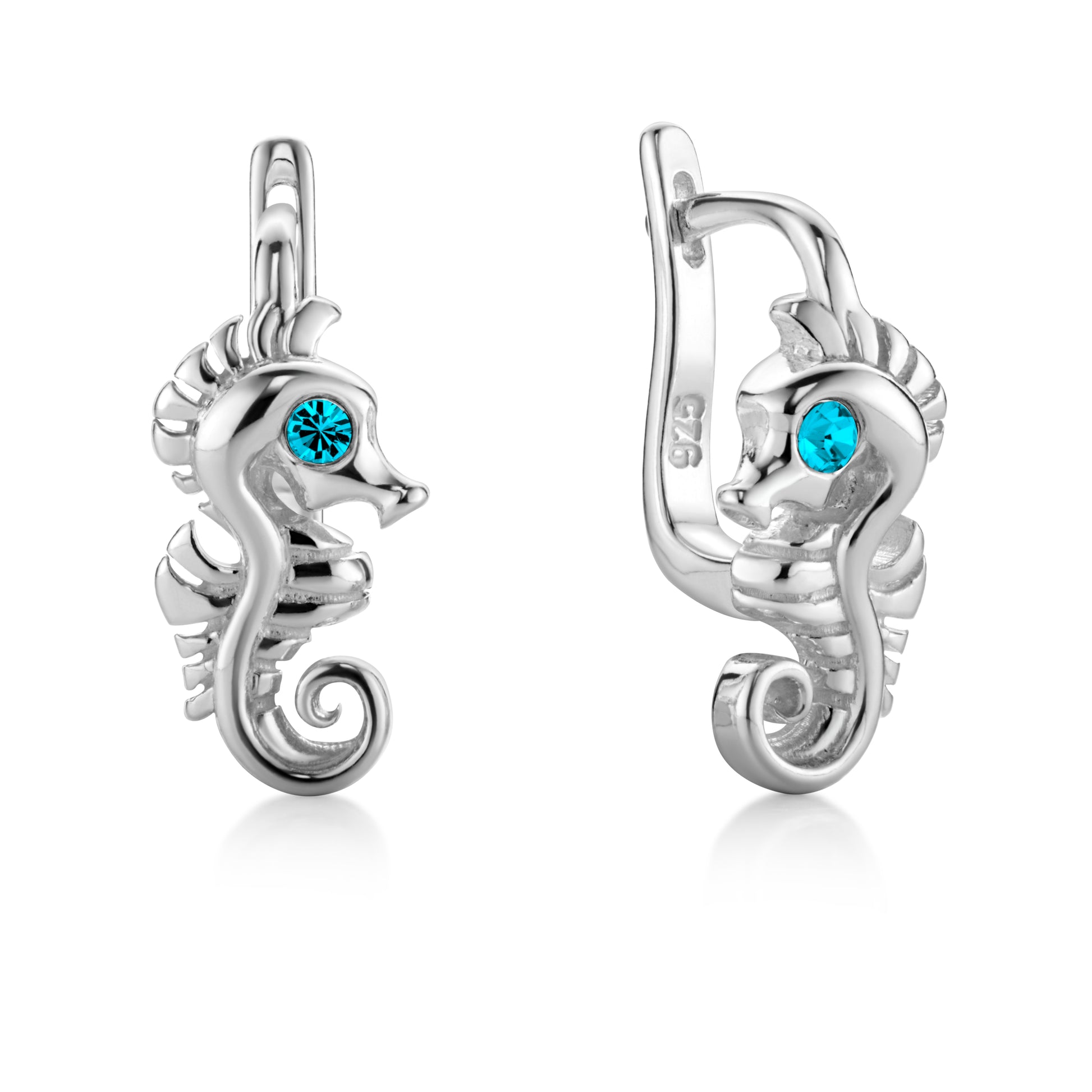 Kinderohrringe Seepferdchen mit türkisen Zirkonia, 10mm x 4mm, aus 925 Silber, Anlaufgeschützt
