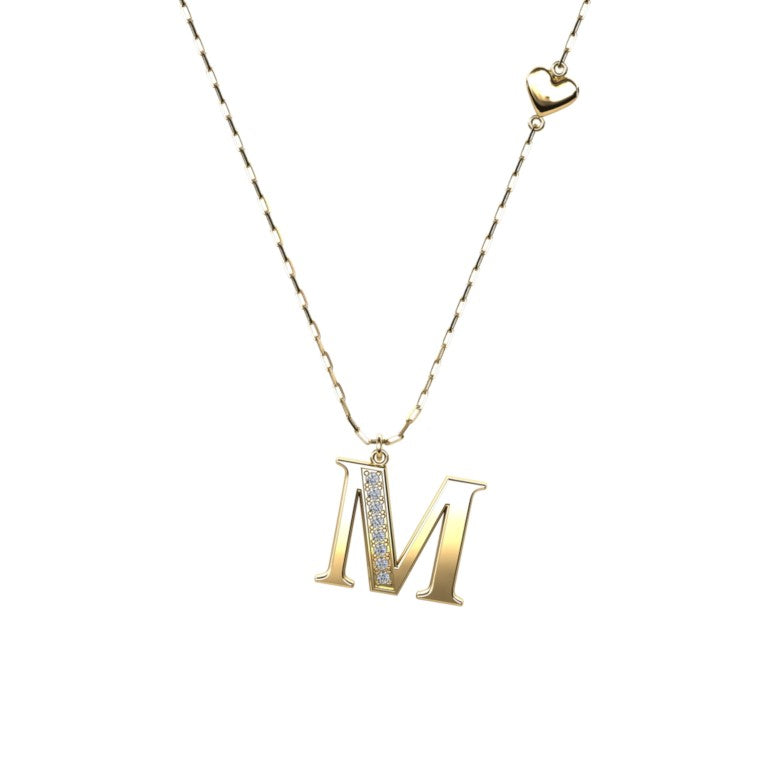 Vergoldete Ankerkette mit einem Buchstaben "M"-Anhänger und einem kleinen Herz, aus 925 Silber, Breite ca. 1 mm, Länge 42 + 3 cm